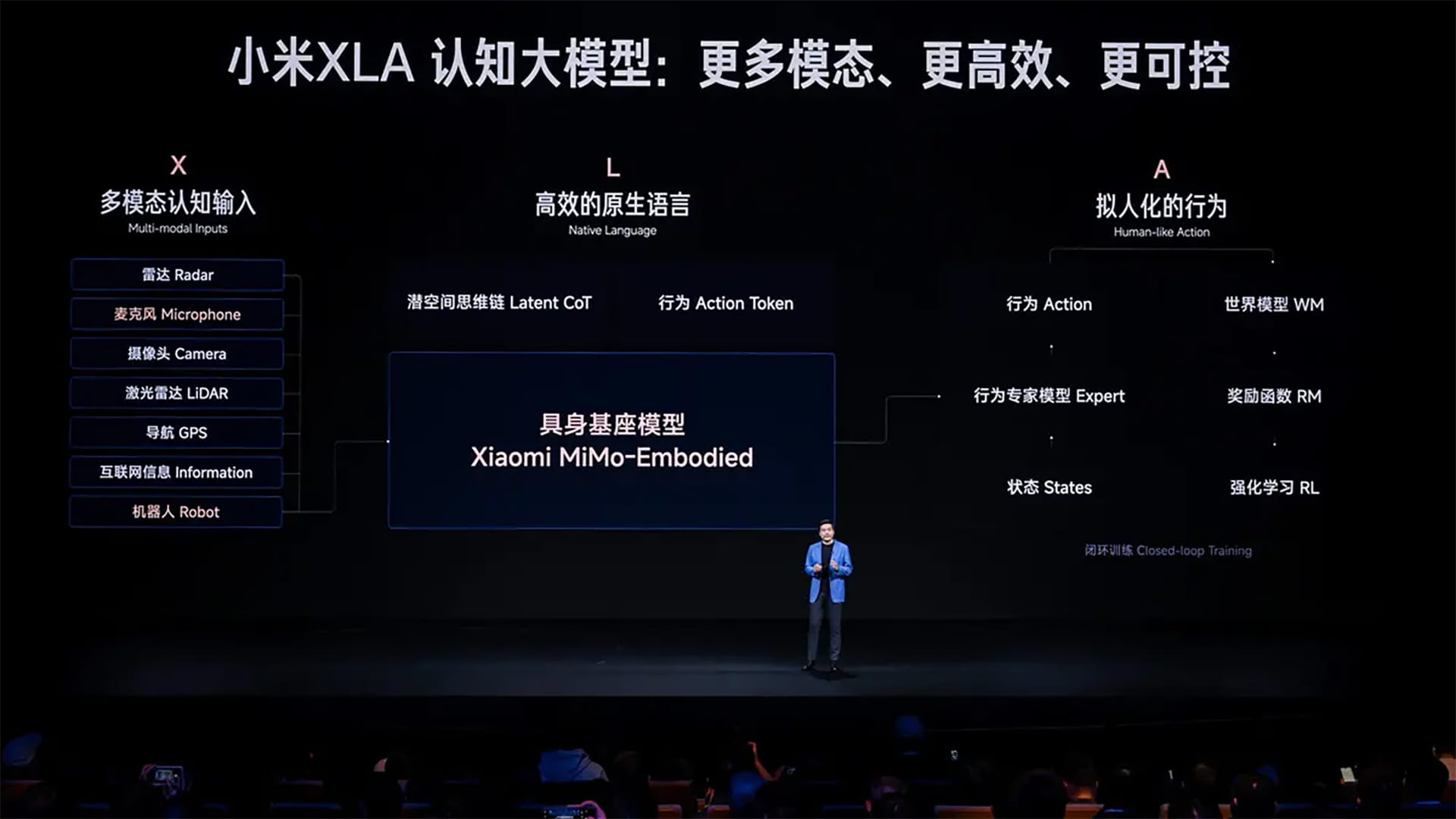 That is also a very important distinction. Other automakers’ cognitive large models are built on open-source models. Xiaomi uses its own MiMo-Embodied foundation model. Because it is self-developed, we were able to add a large amount of embodied intelligence data during the pretraining stage of the foundation model. So the second meaning of the X in XLA is that we have richer data.